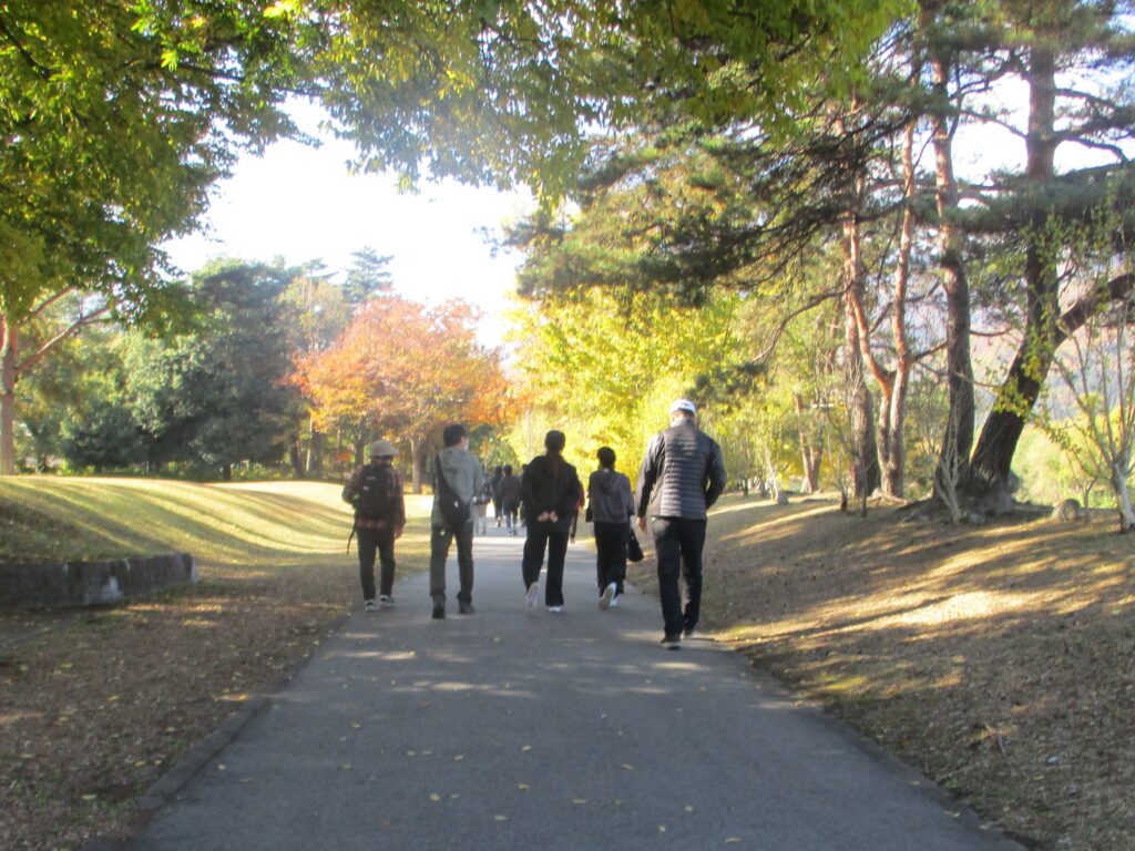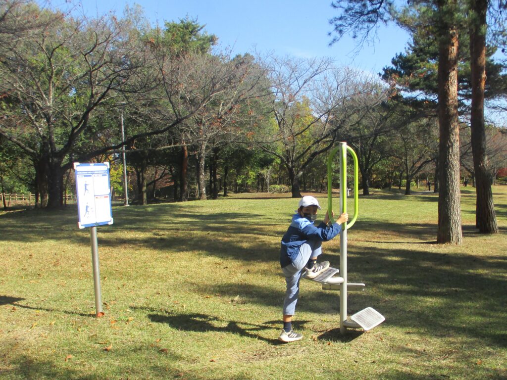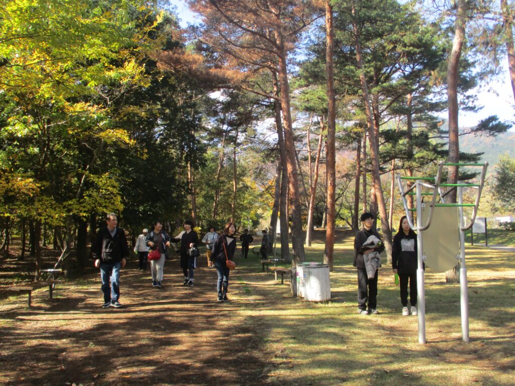開会式が終わると、すぐにウォーキングスタート。広大な公園内の遊歩道を巡る3キロほどの経路を約1時間歩きました。途中で、健康増進器具が設置されている広場に立ち寄り、ストレッチにもトライしていただきました。